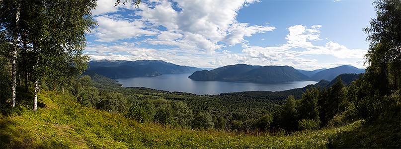 Panoramic view from the observation deck of Teletskoye Lake (village of Yaylu, Turochaksky district, Altai Republic, Russia)